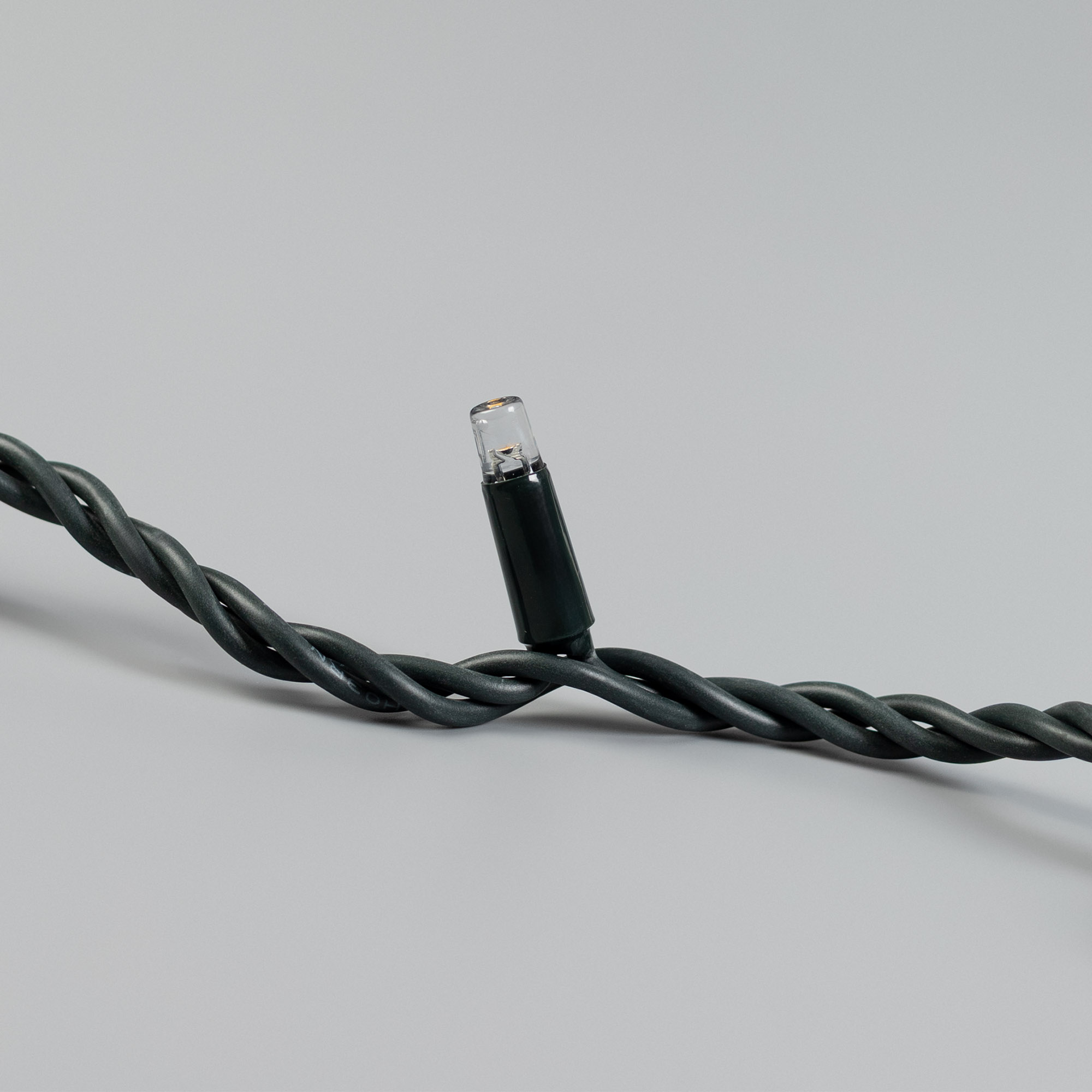 Светодиодная нить Pro. Размер 10000 мм. Цвет свечения ТЕПЛЫЙ БЕЛЫЙ (3000 К). 100 светодиодов размером 7 мм с эффектом медленного мерцания каждого светодиода с резким световым рисунком (прозрачная вогнутая линза). Провод темно-зеленый, каучук. Питание 230 В, Мощность 7 Вт, защита IP65, применение в помещении и на улице под навесом. Аксессуары для подключения и управления приобретаются отдельно.
