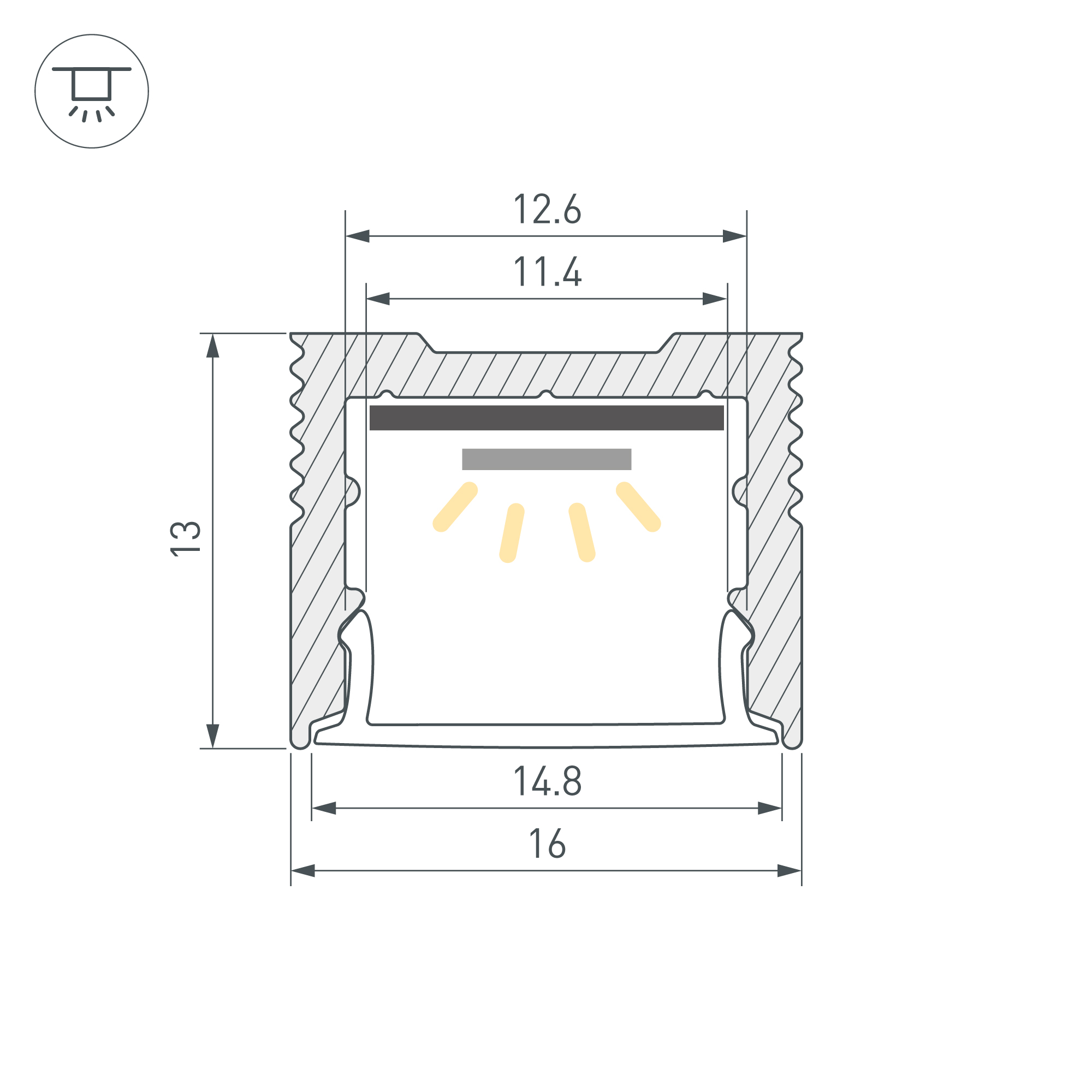Алюминиевый анодированный профиль для светодиодных лент и линеек. Габаритные размеры (L×W×H): 3000x16x13 мм. Ширина площадки для ленты 12,6 мм. Экраны, заглушки и другие аксессуары приобретаются отдельно. Цена за 1 метр.
