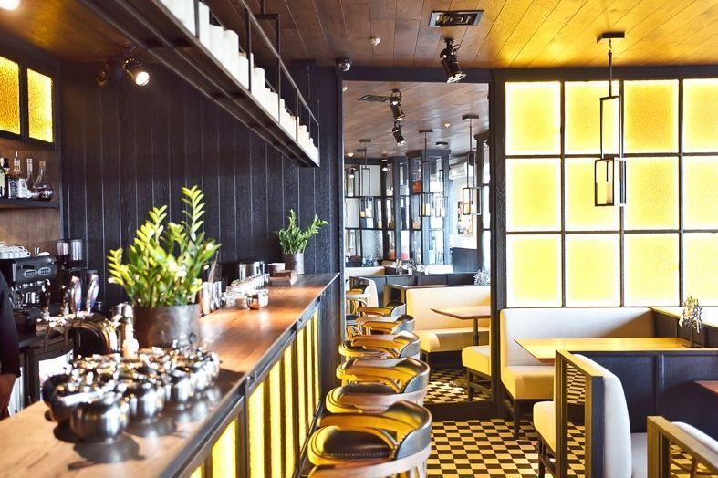 Декоративная и акцентная подсветка бара-ресторана "Solnce" («Солнце») на проспекте Добролюбова в Санкт-Петербурге. В подсветке интерьера использовалось светодиодное оборудование торговой марки