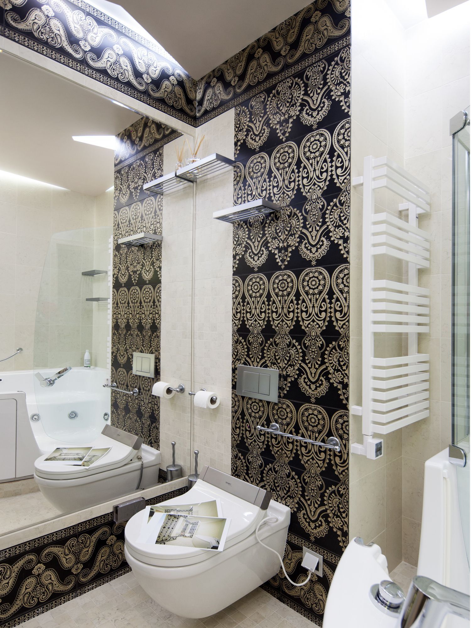 Для ванной в тёплых тонах были выбраны светильники со светодиодными лампами arlight® тёплого белого свечения, дабы создать уютную атмосферу. Для интерьера ванной на другом стенде была применена светодиодная лента arlight® дневного белого свечения, которая была установлена в нишах потолка из гипсокартона и служит в качестве источника основного освещения.