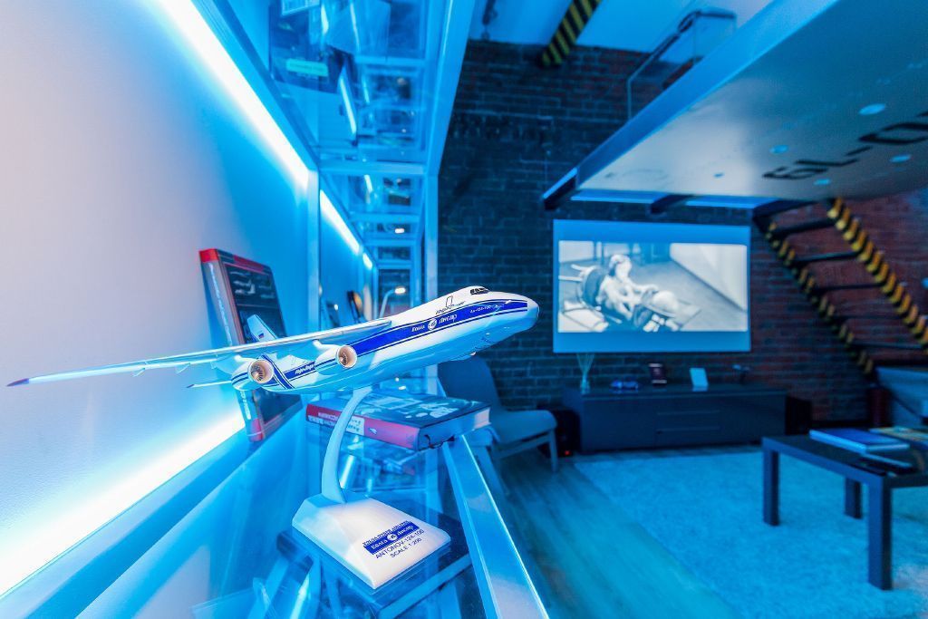 Светодиодная подсветка и светодиодное освещение в квартире-студии дополняет интерьер, выполненный в авиа-тематике.