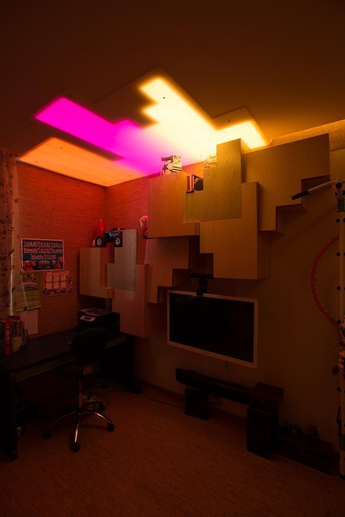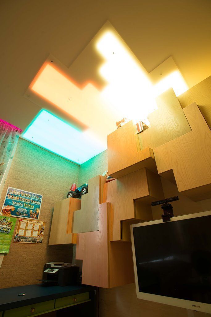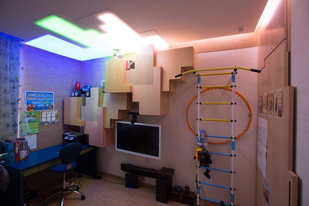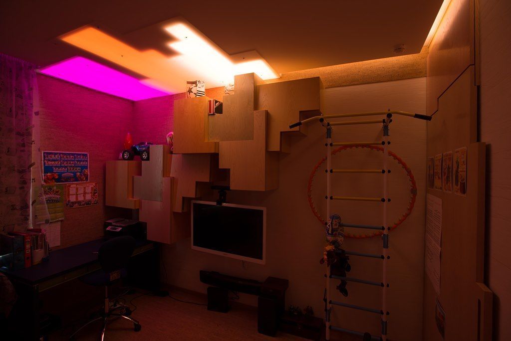 Освещение комнаты для подростка достаточно нестаднартно. Основное освещение и здесь решено с помощью светодиодной ленты arlight®. С одной стороны комнаты в гипсокартонном потолке предусмотрены специальные ниши геометрической формы, внутрь которых RGB-лента arlight® вклеена таким образом, чтобы создавалось равномерное свечение. Ниши также закрыты матовым, пропускающим свет, пластиком. Подобная конструкция, как и полосы в остальных комнатах, одновременно обеспечивает и функциональное, и декоративное освещение. По двум сторонам детской с помощью гипсокартонного потолка образована узкая ниша, в которой также разместилась RGB-подсветка.