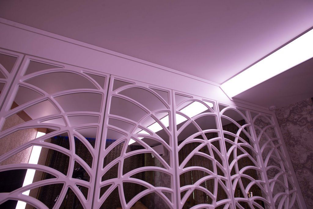 Но основное освещение в комнате не ограничивается широкой световой полосой. Одна из стен, где расположено окно, также украшена тонкими полосками с многоцветными светодиодными лентами arlight®, которые закреплены с помощью врезного алюминиевого профиля arlight® и полностью сливаются с плоскостью стены (если я всё правильно поняла). Свет от них не так бросается в глаза, но является приятной изюминкой интерьера. Отражающееся во множестве зеркал лёгкое мерцание создаёт в комнате удивительную атмосферу. Сочетание яркого света основного освещения и лёгкого мерцания декоративной подсветки
