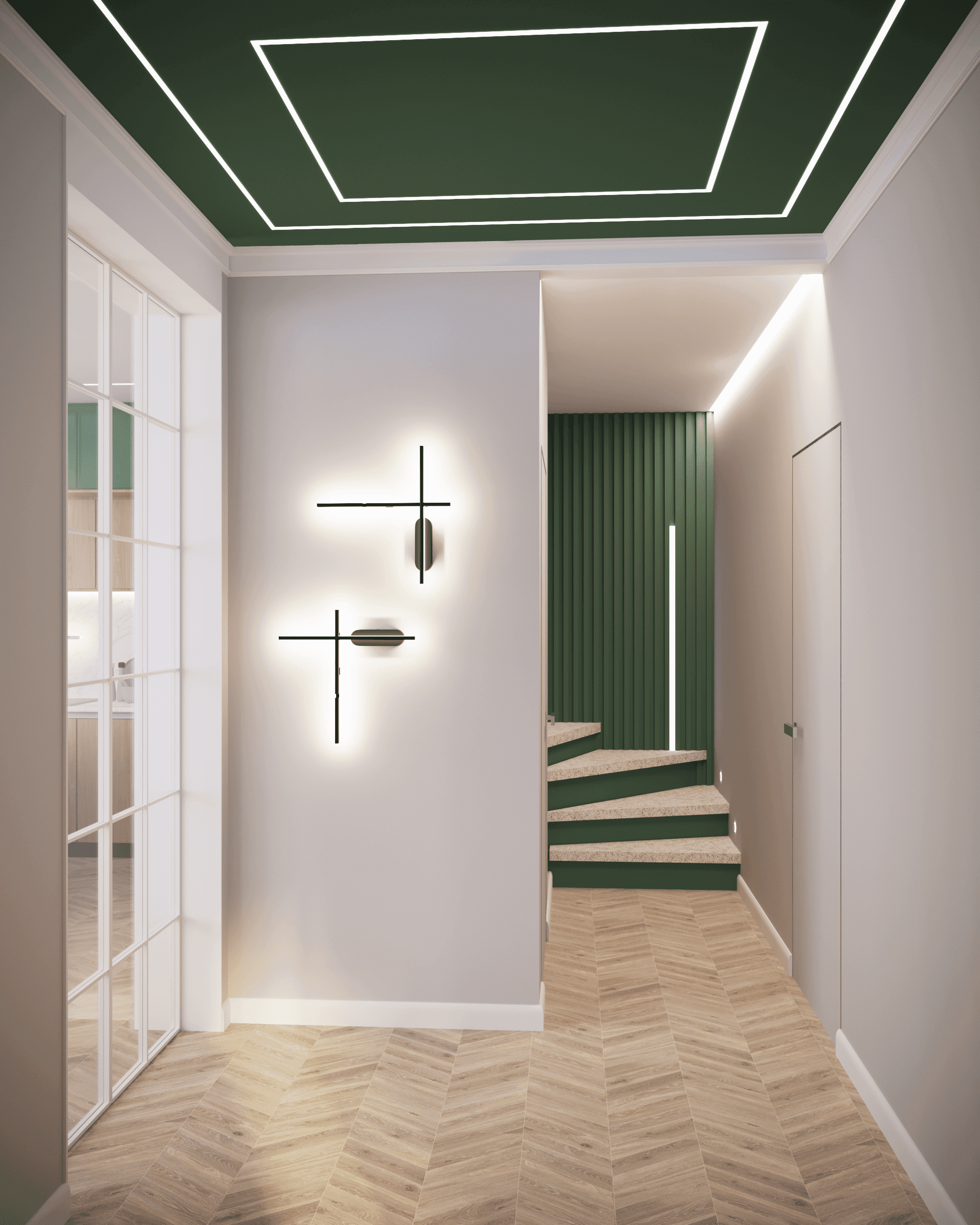В проекте применялись анодированные профили с экраном и светодиодные ленты дневного белого свечения. Тонкие световые линии гармонично интегрированы в различные помещения. Другая часть основного освещения создана с помощью больших потолочных светильников, которые выразительно контрастируют с простыми линейными светильниками.